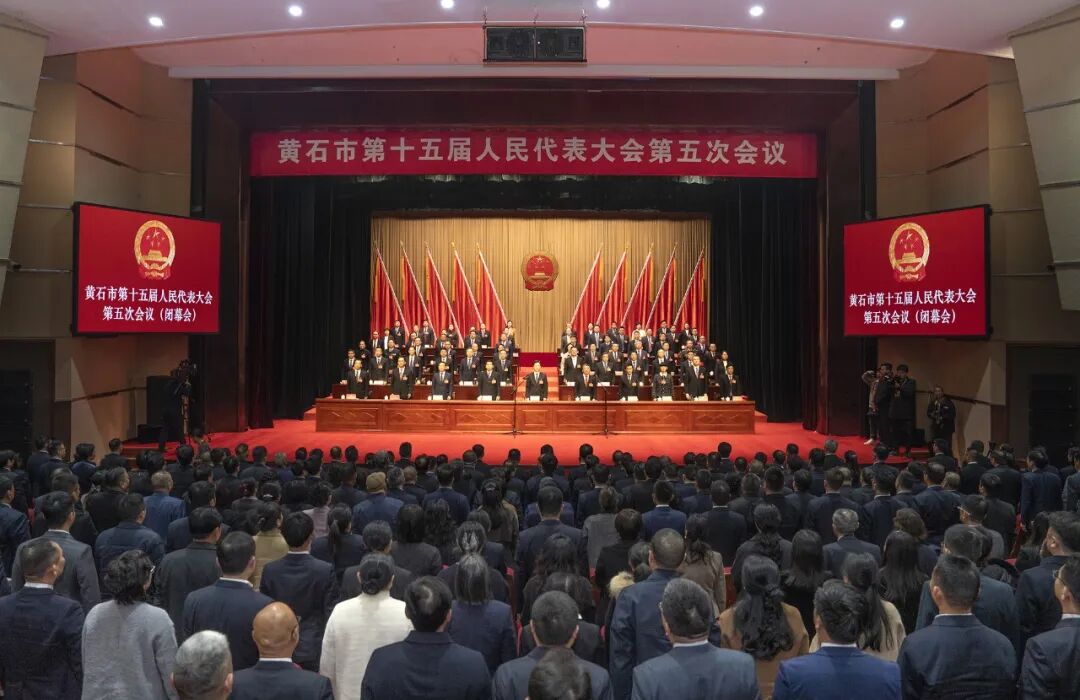 1月17日下午,黄石市十五届人大五次会议圆满完成各项议程,在磁湖剧院闭幕。