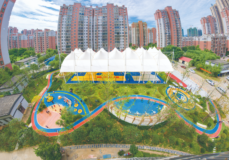 目前,公园内设有11个功能区,其中包括主入口广场、智能景观路径、老年人棋牌区、负重力量区、多功能篮球场、羽毛球场、乒乓球场、智能单车竞赛区、儿童游乐区以及绿化景观等,满足了不同年龄层居民的健身和娱乐需求。
