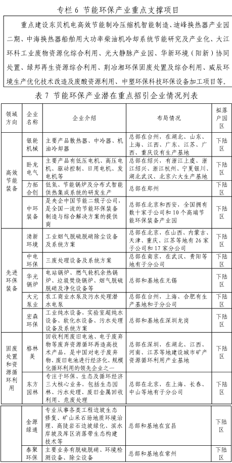 先进环保装备。加快打造国家节能环保产业园。重点围绕工业烟气排放治理装备,突破高效除尘、脱硫脱硝、烟气消白等治理技术,重点发展集成多功能的成套烟气处理装备,鼓励发展大气污染智能监测仪器仪表。支持引进具备水处理、土壤修复相关技术资质的企业,延伸发展生态修复服务,大力发展矿山修复、土壤修复、地下水修复用材料设备和工程服务。