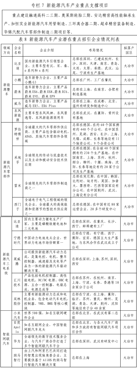 紧扣汽车绿色化、轻量化、智能化、网联化发展趋势,强化产业链精准招商,重点发展新能源整车、汽车零部件及新能源汽车电池、电机、电控系统等领域。到“十四五”末,全市新能源汽车产业产值规模力争达到100亿元,基本形成汽车与智能技术相互融合、整车与零部件相互促进的发展格局。