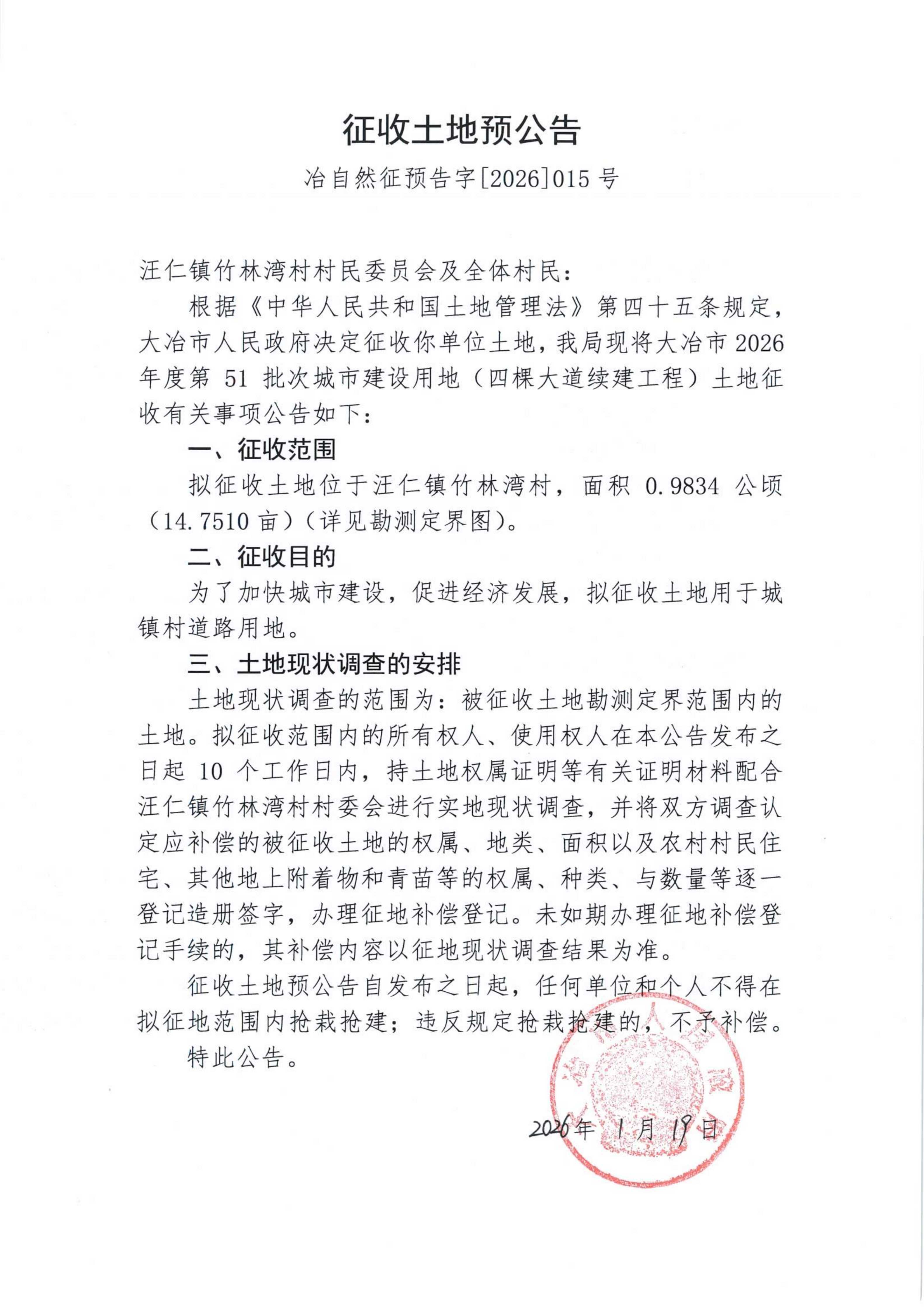征收土地预公告——冶自然征预告字[2026]004、005、006、007、008、009、010、011、012、013、014、015号