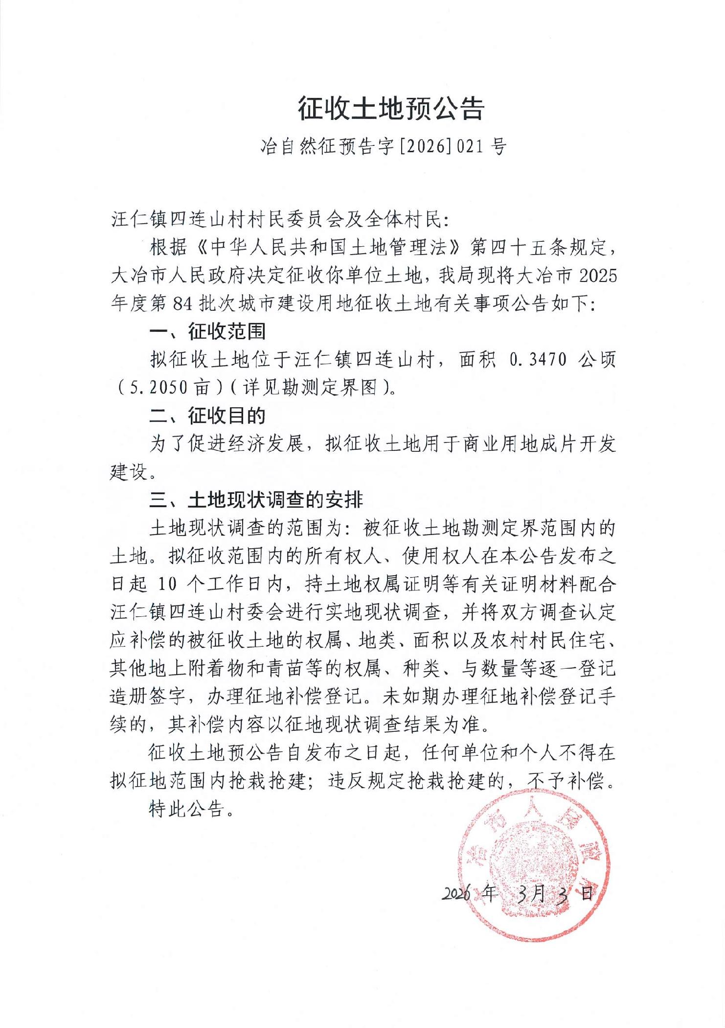 征收土地预公告——冶自然征预告字[2026]021号
