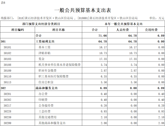 公共预算财政拨款基本支出71.67万元,其中人员经费64.78万元,包括基本工资16.17万元、津贴补贴10.73万元、绩效工资17.35万元、机关事业单位基本养老保险缴费5.74万元、职业年金缴费2.87万元、其他社会保障缴费6.35万元、住房公积金5.56万元;公用经费6.89万元:包括办公费0.4万元、印刷费0.4万元、工会经费0.93万元、公务接待费0.2万元、其他交通费用2.10万元、其他商品和服务支出2.86万元。