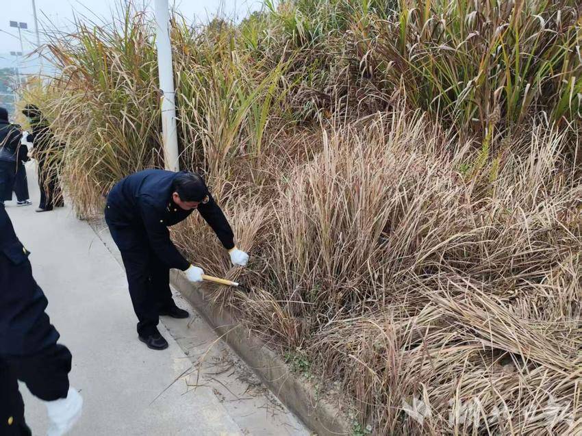 12月20日,金山街道综合执法中心组织全体工作人员,重点对王圣大道路段沿线的枯枝落叶及堆积杂草进行了全面清理。行动中,工作人员分工协作,利用扫帚、铁锹等工具,不仅细致清扫了路面可见的枯枝落叶,也对道路两侧的卫生死角进行了深度整治。同时,为严防烧荒行为发生,工作人员深入田间地头及道路周边零散荒地,对枯草进行割除,并统一清运至垃圾中转站进行集中处理,从根本上减少了可供焚烧的物料。此次行动累计清理道路长度约1200米,清运各类枯枝、落叶、杂草共计11车。