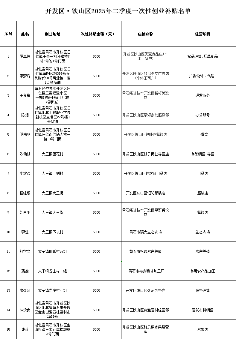 开发区·铁山区2025年二季度一次性创业补贴名单