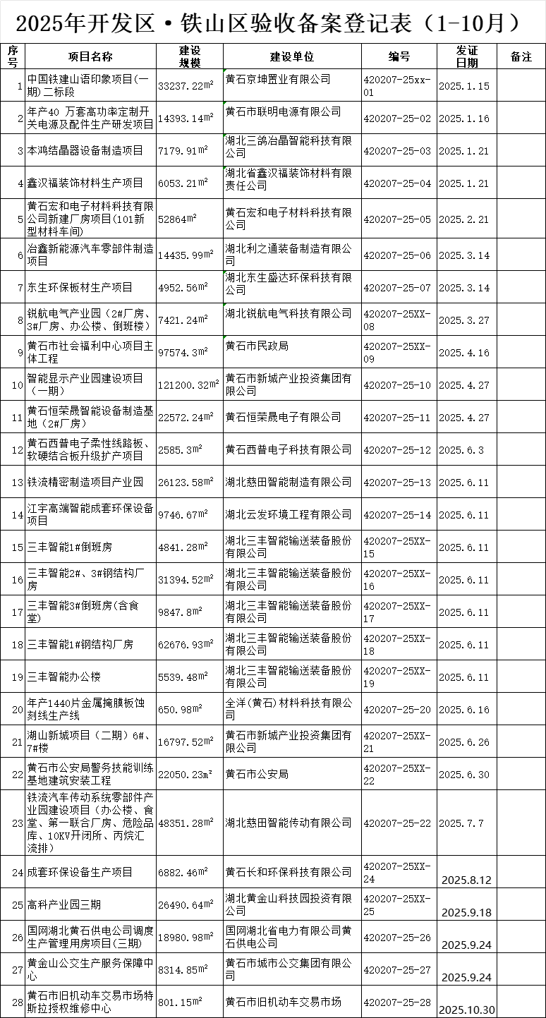 2025年开发区·铁山区验收备案登记表(1-10月)