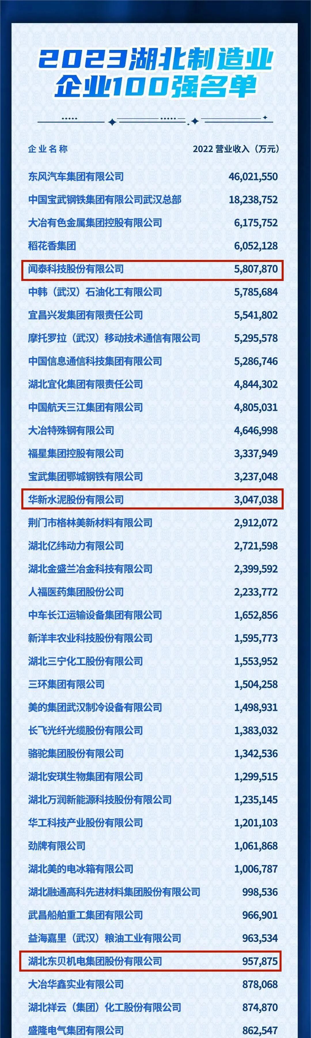 华新水泥股份有限公司获评2023湖北企业100强第36名、2023湖北制造业企业100强第15名