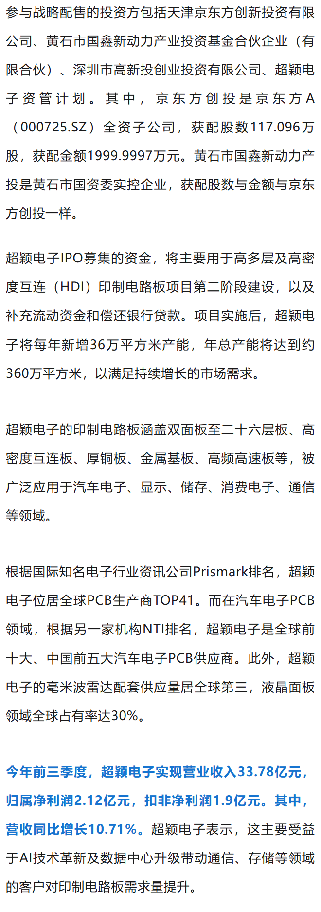 超颖电子是我国台湾上市公司定颖投控(3715.TW)旗下企业,于2015年落户黄石开发区·铁山区,建有P1和P2两个自动化工厂,在黄石累计投资已达40亿元,已成为全球印制电路板(PCB)头部企业。