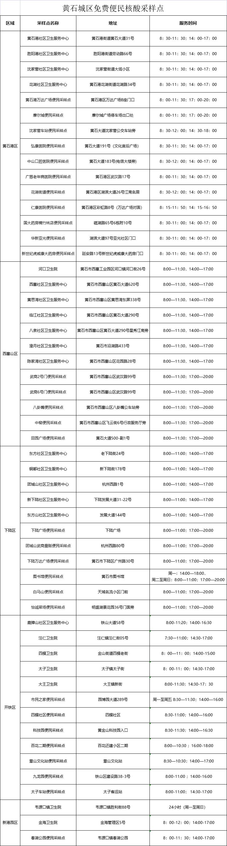 据市疫情防控指挥部消息,为方便市民就近做核酸检测,黄石市公布城区最新常态化便民核酸采样点信息,具体如下: