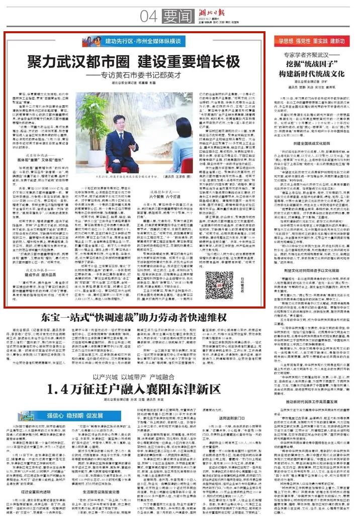 聚力武汉都市圈 建设重要增长极——《湖北日报》专访黄石市委书记郄英才