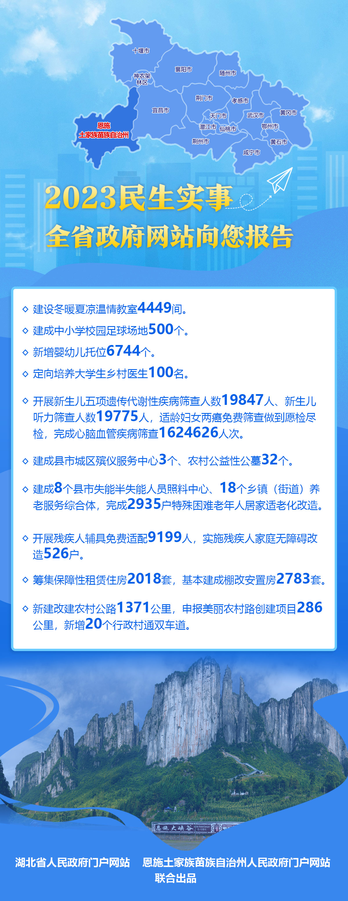 新增婴幼儿托位、建设冬暖夏凉温情教室、老年人居家适老化改造、兴建社区幸福食堂、修好通村公路、开通乡镇公交专线、增加城区停车位和新能源充电桩、改善医疗条件……近期,湖北各地召开的“两会”,陆续公布了2023年民生实事办理情况。今起,全省政府网站向您报告!让我们怀揣共同缔造美好生活的愿景,奔向更加“荆”彩的2024!