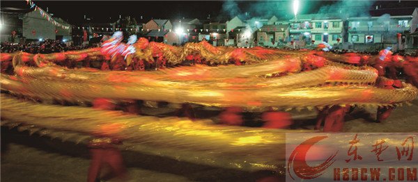 15日晚20时许,村头广场上300余壮汉同时舞动三条巨龙,时而翻江倒海;时而腾空盘旋,围观的群众目不暇接。一位长者告诉记者,300多人同时舞动三条巨龙真的不容易,不仅对技艺要求极高,而且协调性极强,龙头行一步,龙尾跑十步……