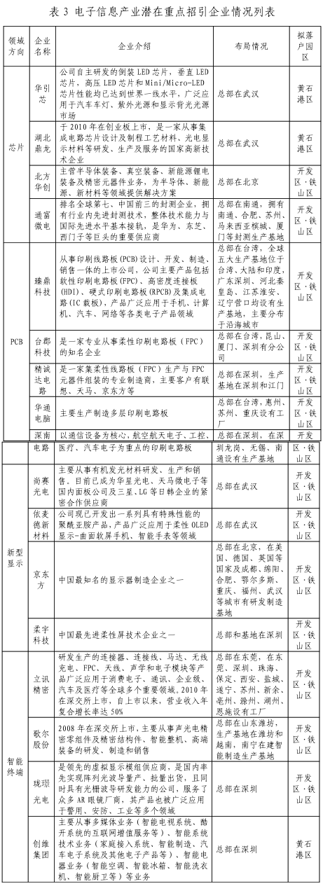 按照“对接武汉、突出特色、抢占高点、发展终端”的思路,推动产业链向上下游延伸、价值链向高端拓展,推进新一代信息技术应用突破与融合发展,推进大冶湖高新区、黄金山开发区共建电子信息产业园,积极布局芯片、PCB、新型显示、智能终端等领域,培育壮大“芯板屏端”产业,打造特色鲜明、实力突出、示范带动作用显著的产业集聚区。到“十四五”末,全市电子信息产业产值规模力争达到1000亿元,打造全国电子信息基础产业基地,建成全国最大PCB产业集聚区。
