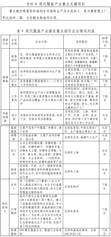 紧抓服装产业深度调整机遇,着力提升产品研发设计能力,实施增品种、提品质、创品牌“三品”战略,大力发展高档服装、时尚服饰、智能服装等领域。到“十四五”末,全市现代服装产业产值规模力争达到100亿元,产业个性化定制等新模式得到广泛应用,努力打造中部地区现代服装生产基地。
