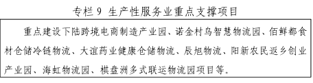 1.夯实工业服务支撑。着力提升生产性服务业供给能力,围绕研发设计、检验检测、现代物流、金融服务、电子商务、人力资源、科技咨询等方面,新建或引进一批专业化服务机构,构建全产业链区域服务体系。推动生产性服务业向专业化和价值链高端延伸,加快建设一批面向先进制造业的生产服务支撑平台。鼓励有条件的企业和高校院所将研发中心、设计中心、检验检测中心等平台向社会开放,探索建立以市场化盈利机制提供专业化服务。强化多式联运物流支撑,发挥沿江、临空多重优势,加快推动航空港、铁路港、公路港、水运港“四港”无缝衔接,建立全过程物流服务联盟,打造联通国际国内的物流枢纽,构建全球123快货物流经济圈(国内1天送达、周边国家2天送达、全球主要城市3天送达)。
