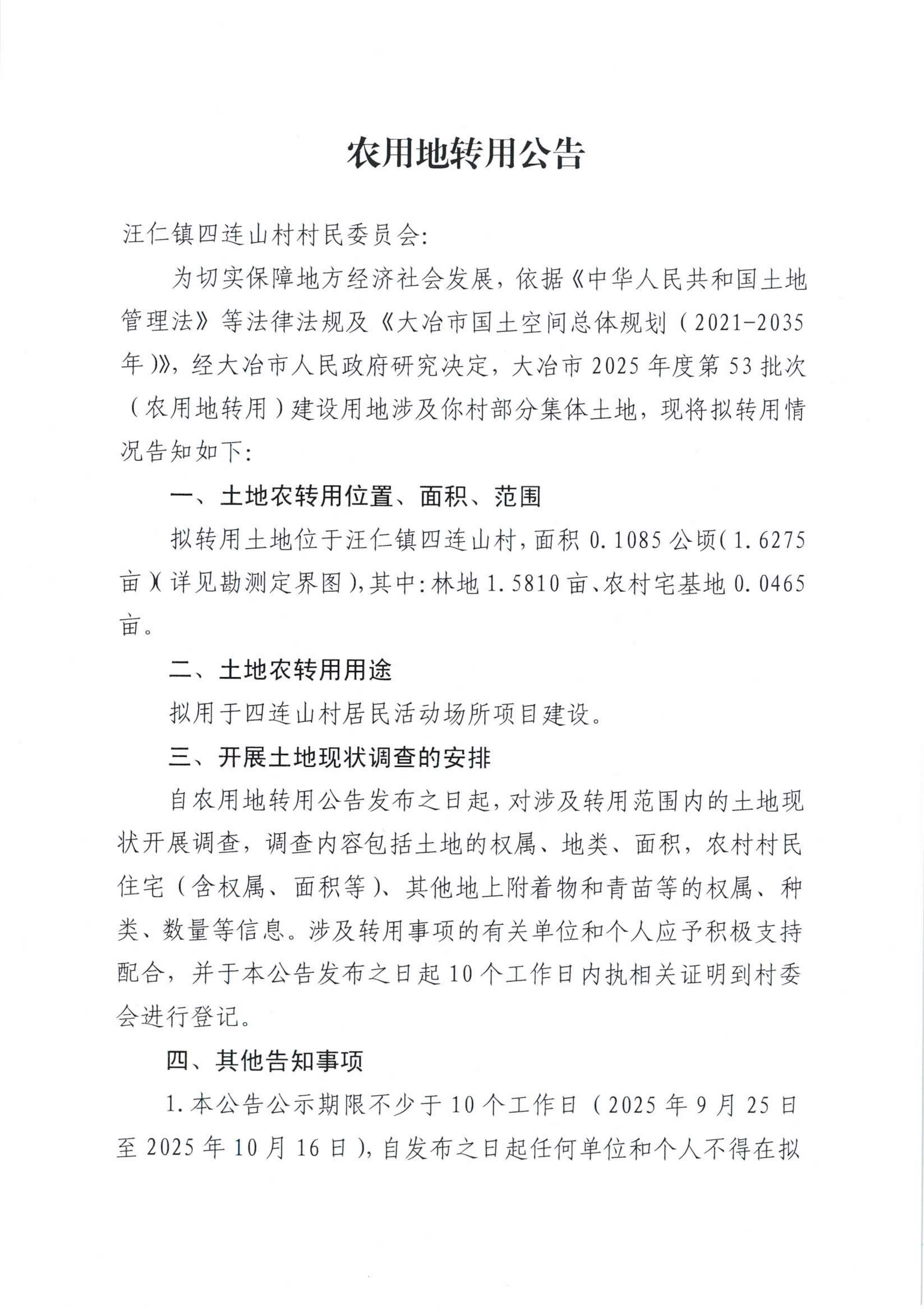 农用地转用公告(汪仁镇四连山村)