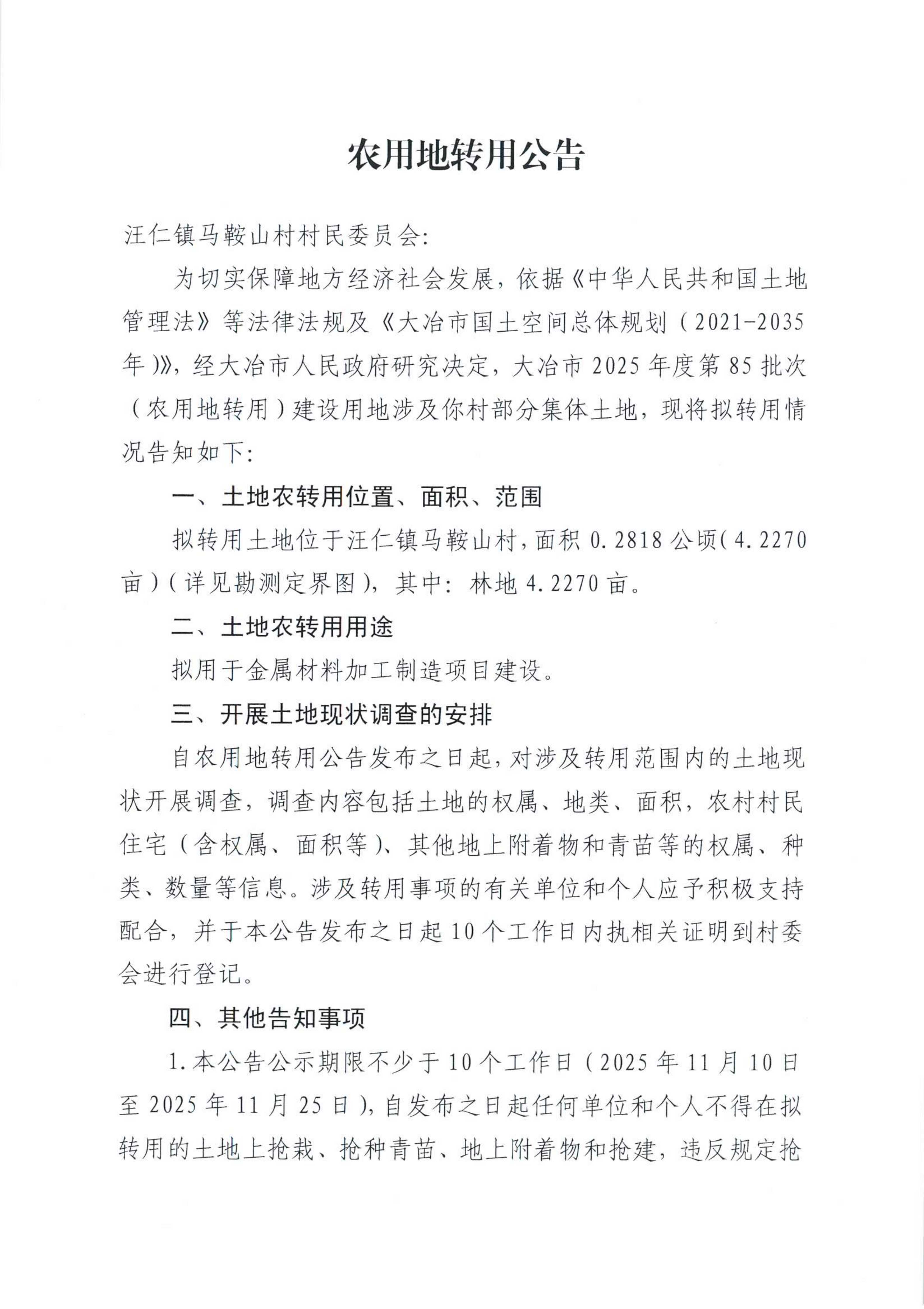 农用地转用公告(汪仁镇马鞍山村)