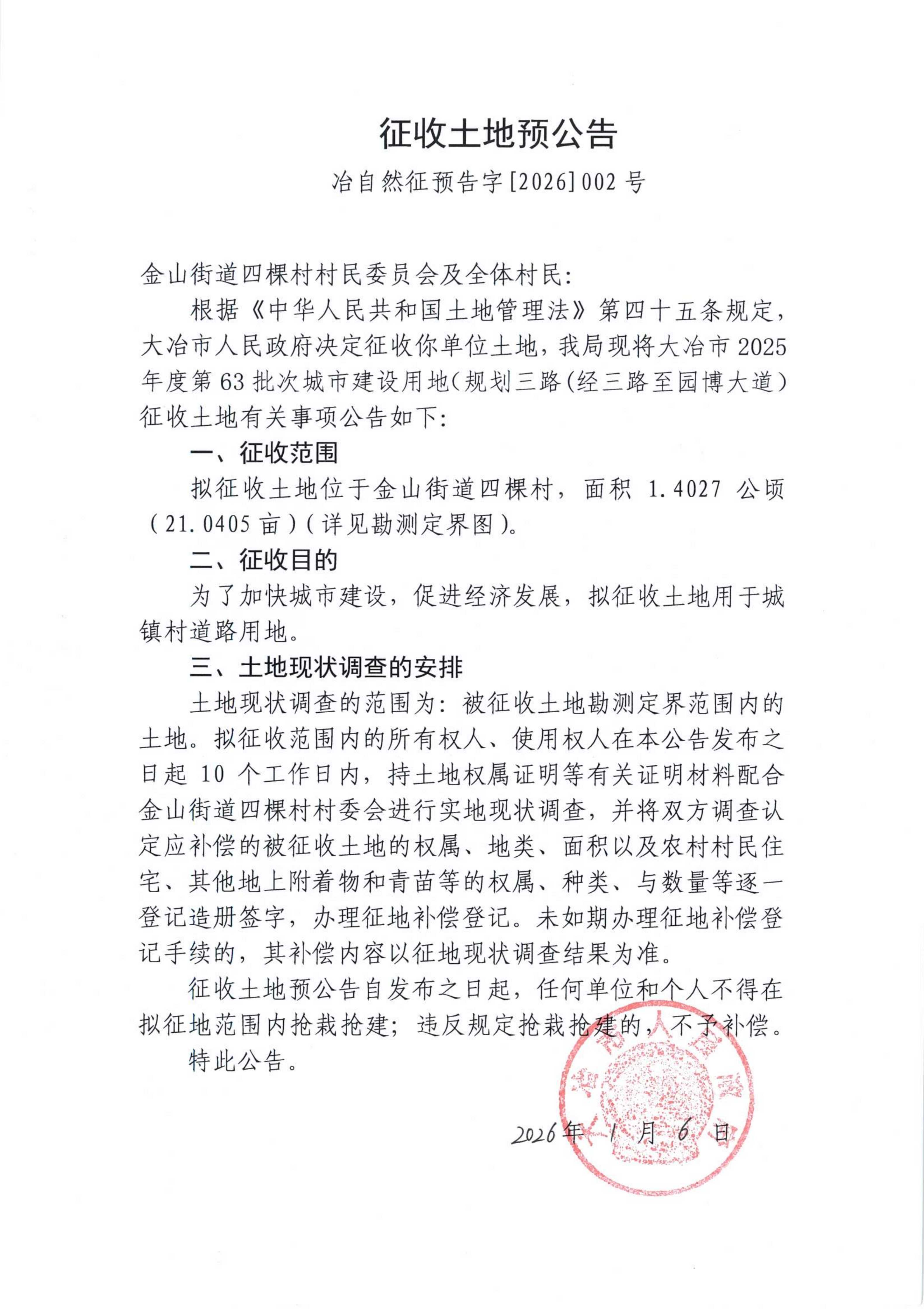 征收土地预公告——冶自然征告字[2026]002号