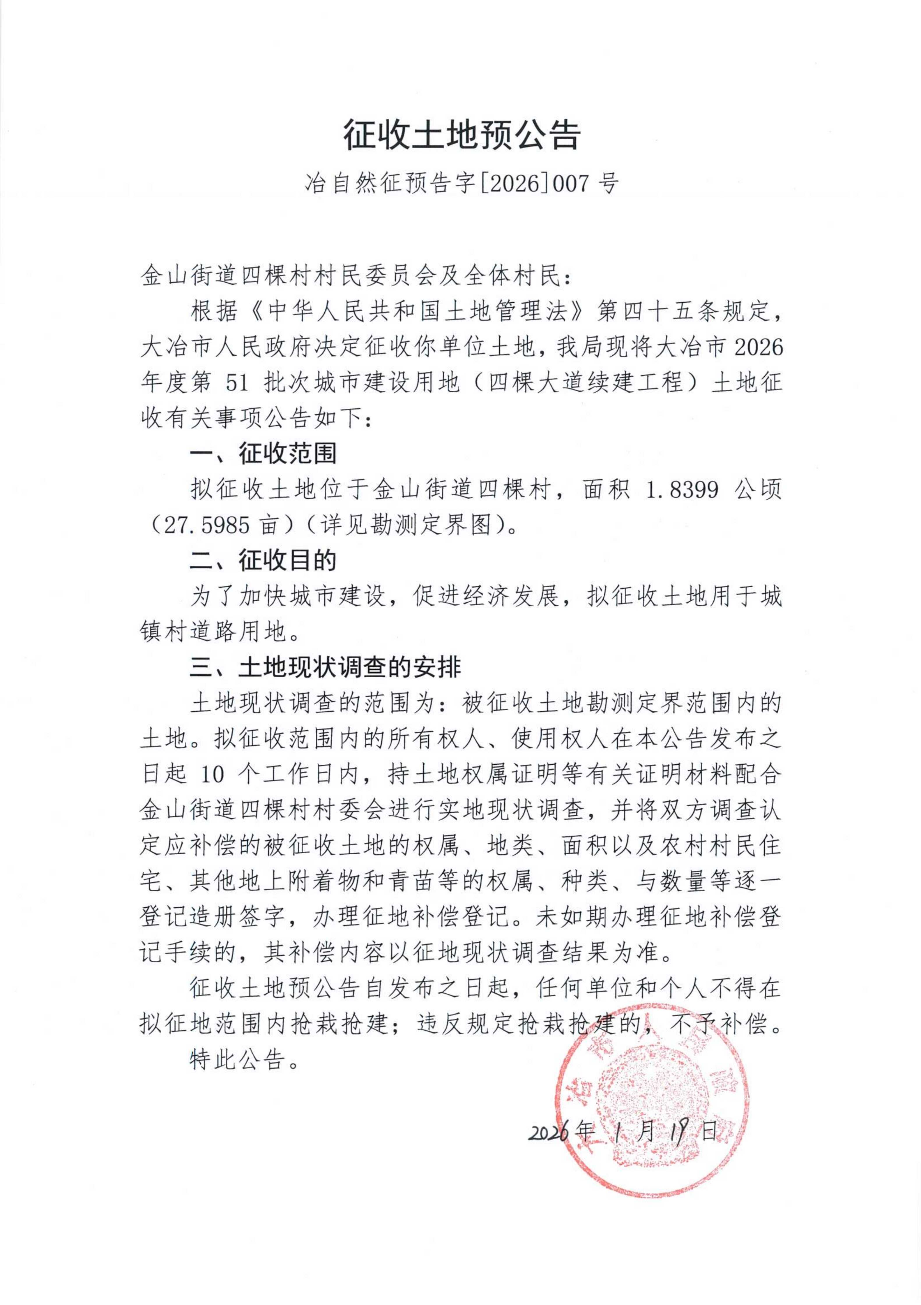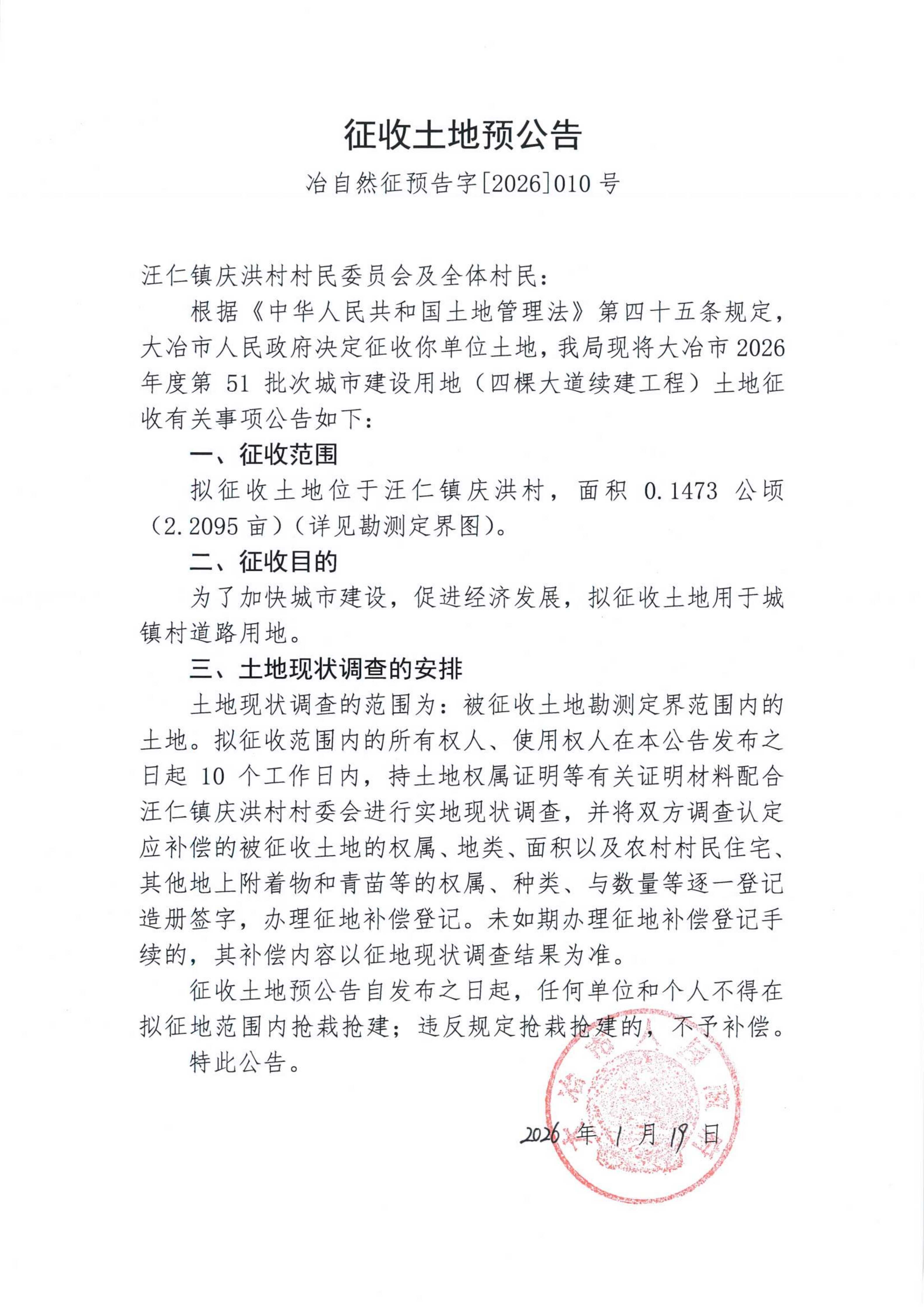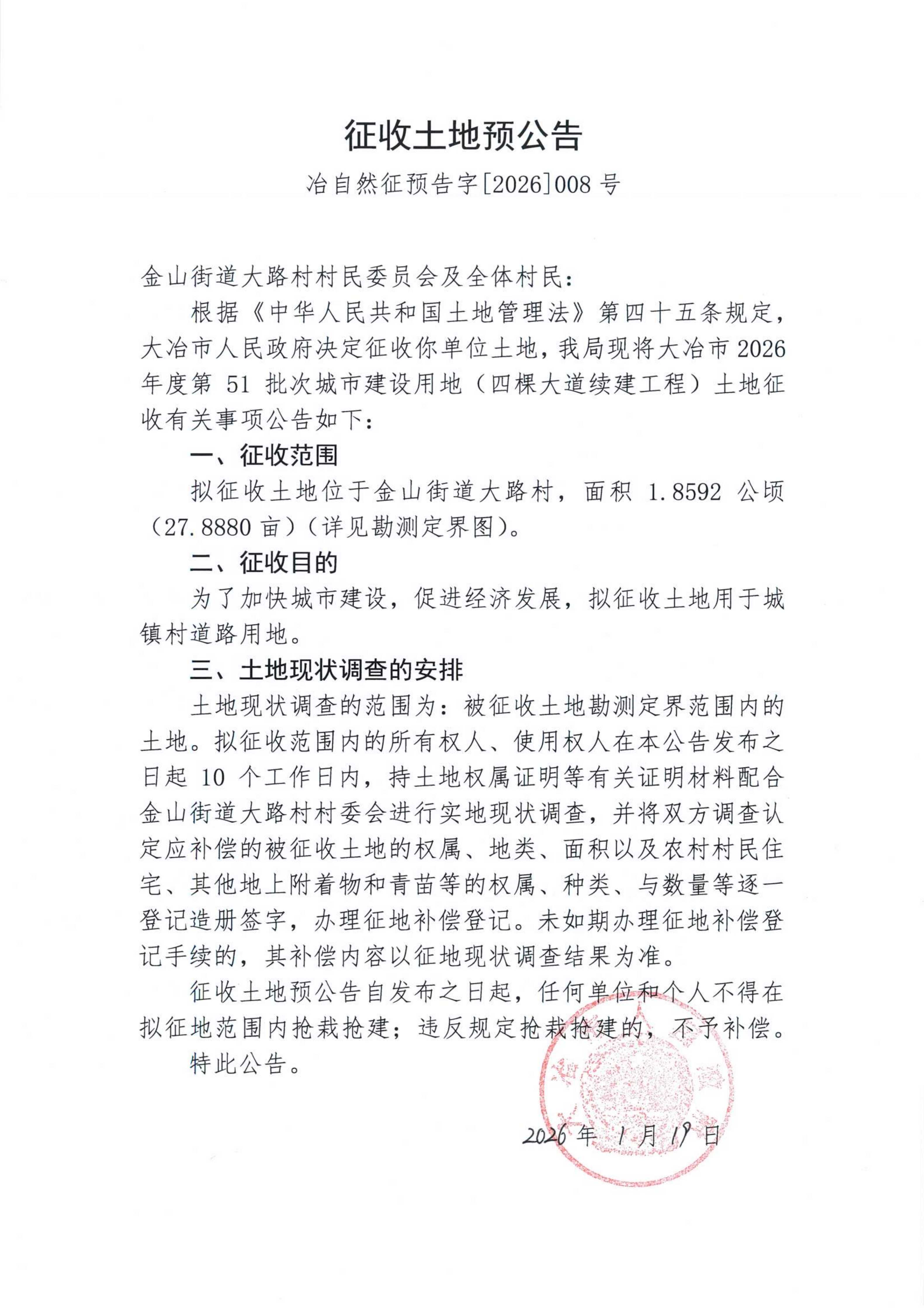 征收土地预公告——冶自然征预告字[2026]004、005、006、007、008、009、010、011、012、013、014、015号