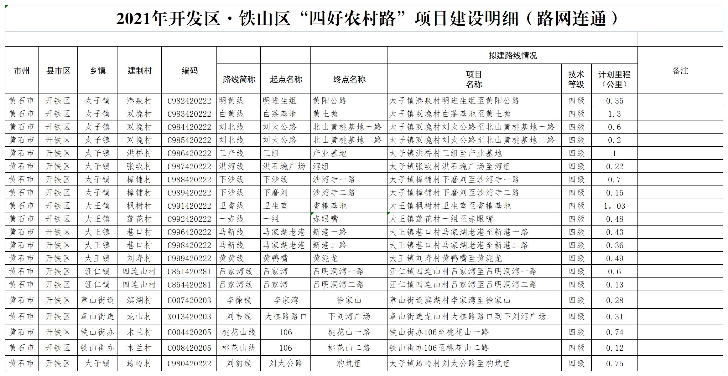 2021年开发区·铁山区“四好农村路”项目建设明细(路网连通)