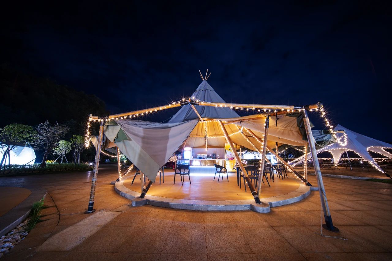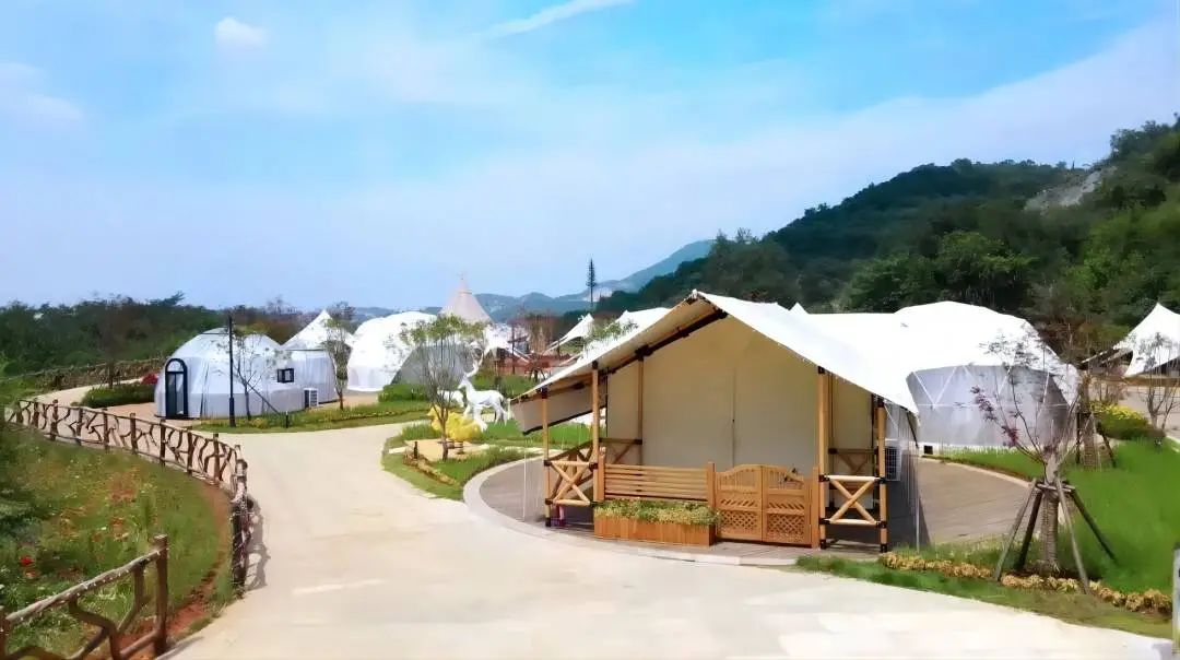 放眼四周一栋栋精致的帐篷式酒店客房分散罗列,