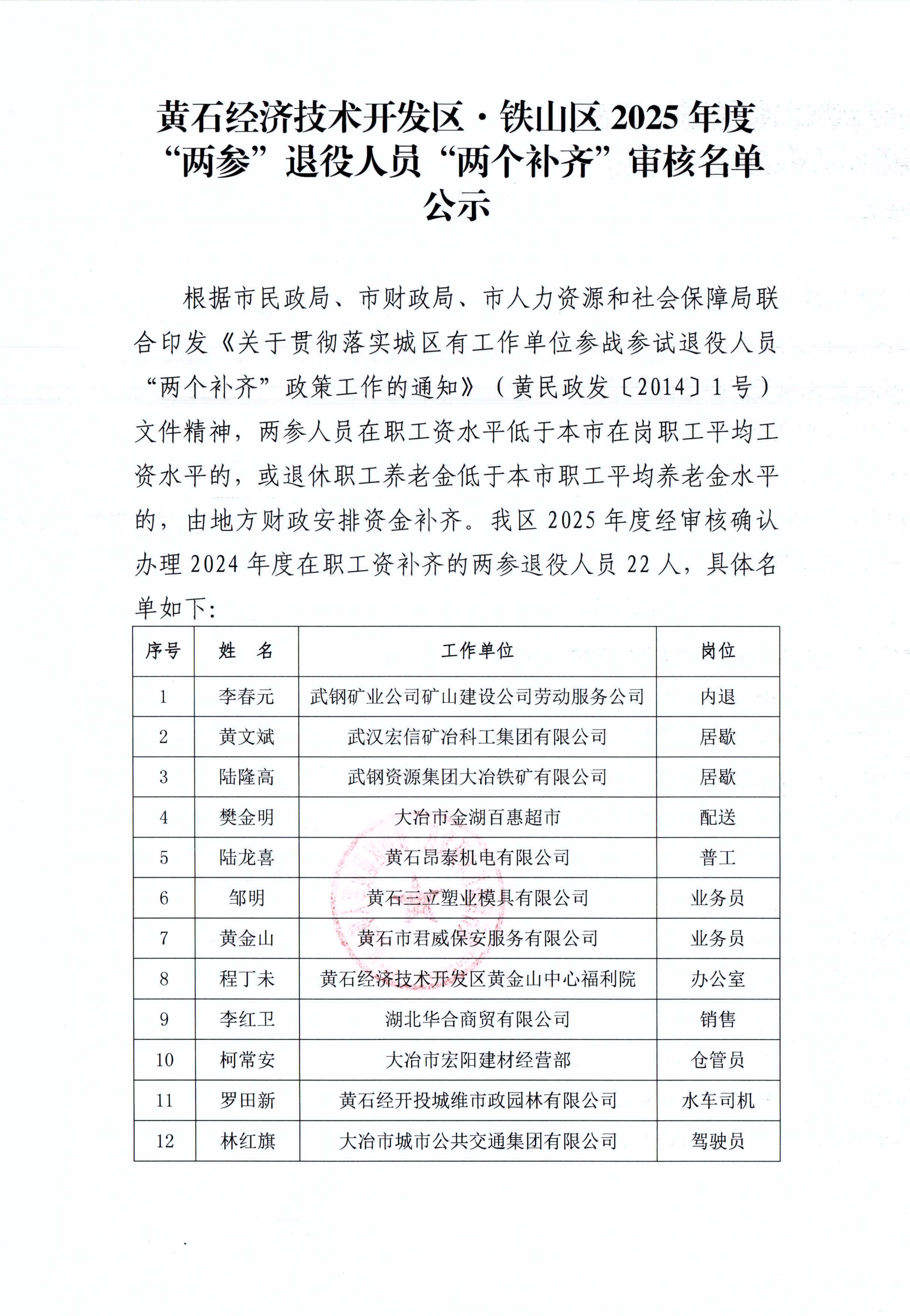 黄石经济技术开发区·铁山区2025年度 “两参”退役人员“两个补齐”审核名单公示