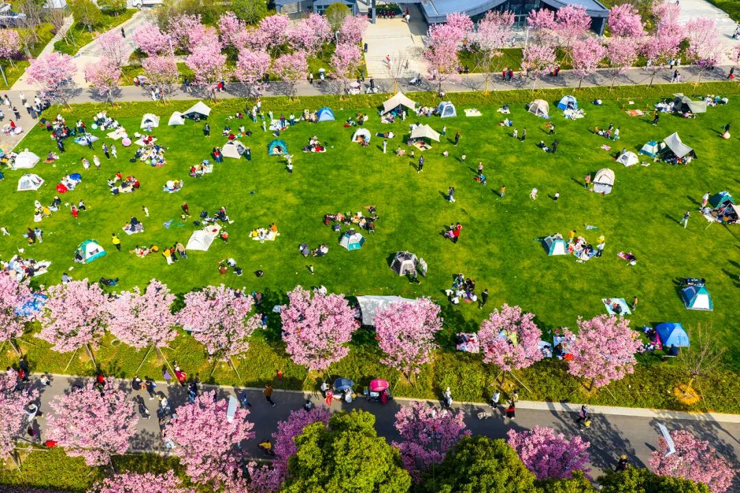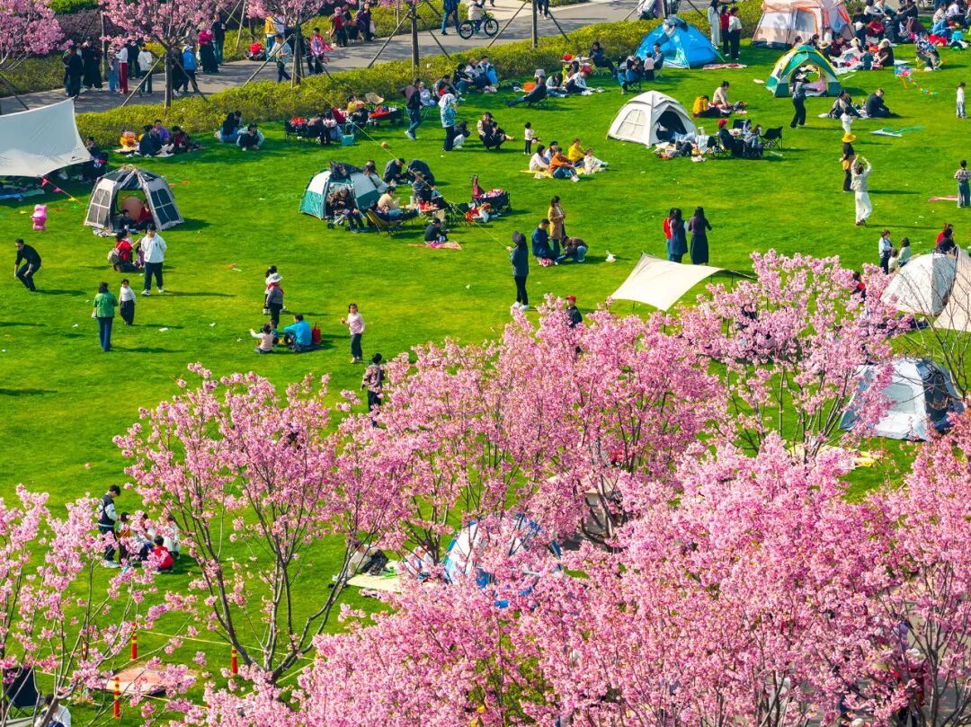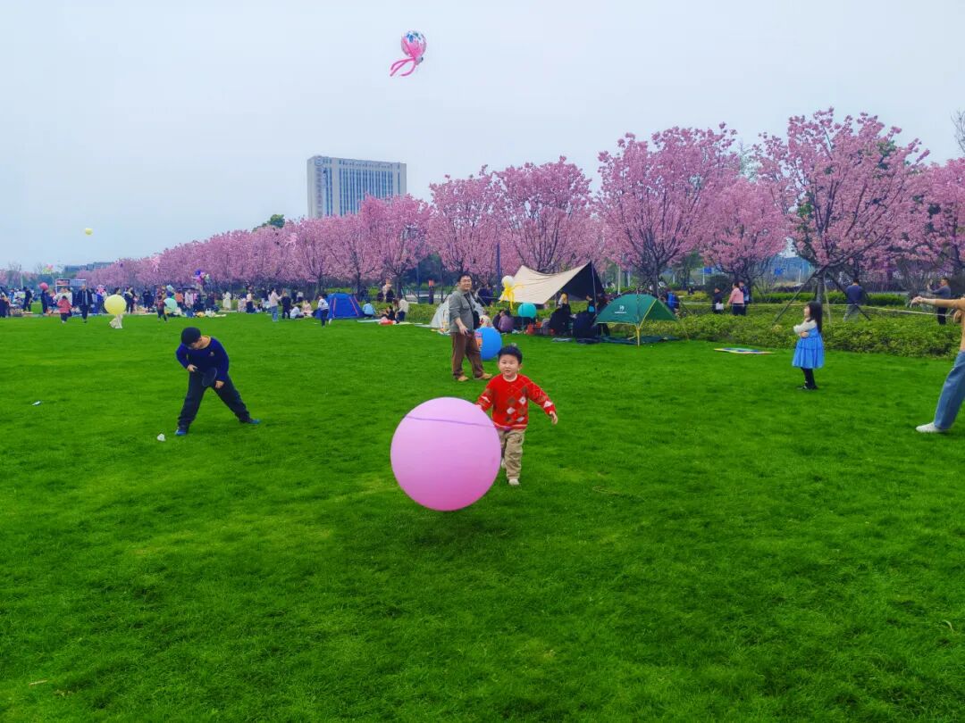 3月22日,位于开发区·铁山区的黄石奥体公园花客厅里,千株粉樱竞相盛放,樱花大道如梦似幻,开阔的大草坪上处处洋溢着轻松欢快的气息——这里既有举家踏青的市民围坐野餐、孩童迎风放风筝的热闹烟火,也有企业职工户外路演、团建踏青的蓬勃朝气。