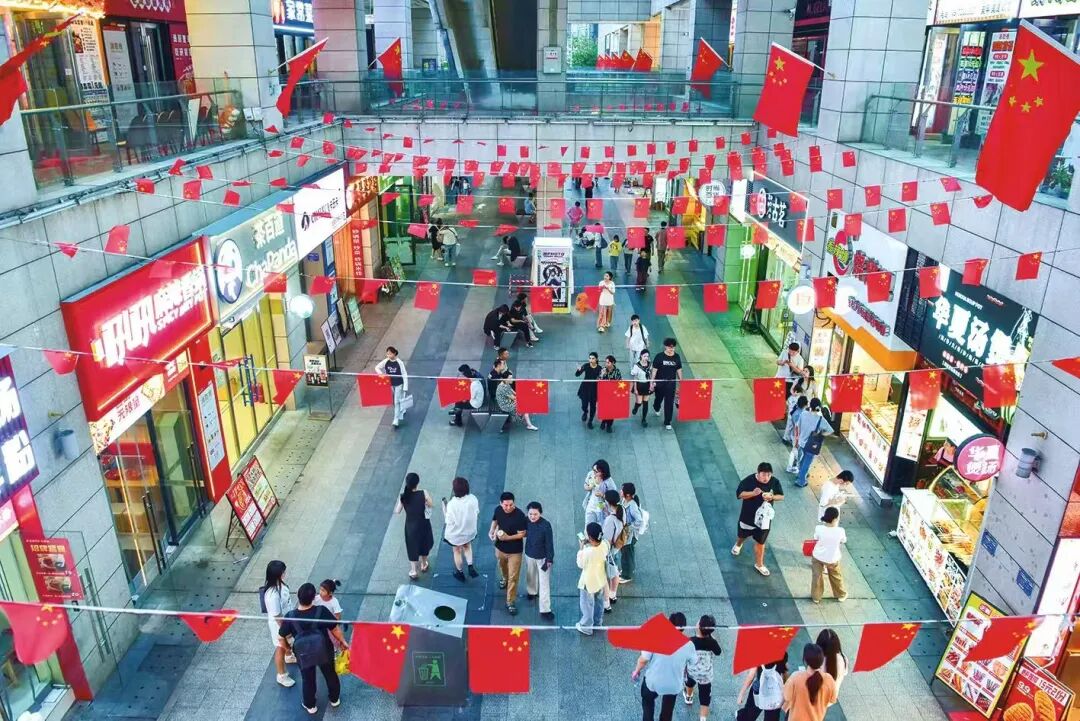 双节首日,黄石港区摩尔城、万达广场两大商圈率先开启“热闹模式”。鲜艳的五星红旗迎风招展,红色气球缠绕交织,在商场内外勾勒出一条满溢喜庆氛围的“红色长廊”。不少年轻人特意前来打卡,举起手机定格这抹“中国红”——他们在逛商圈、购好物的间隙,沉浸式感受着节日里浓厚的爱国情怀。