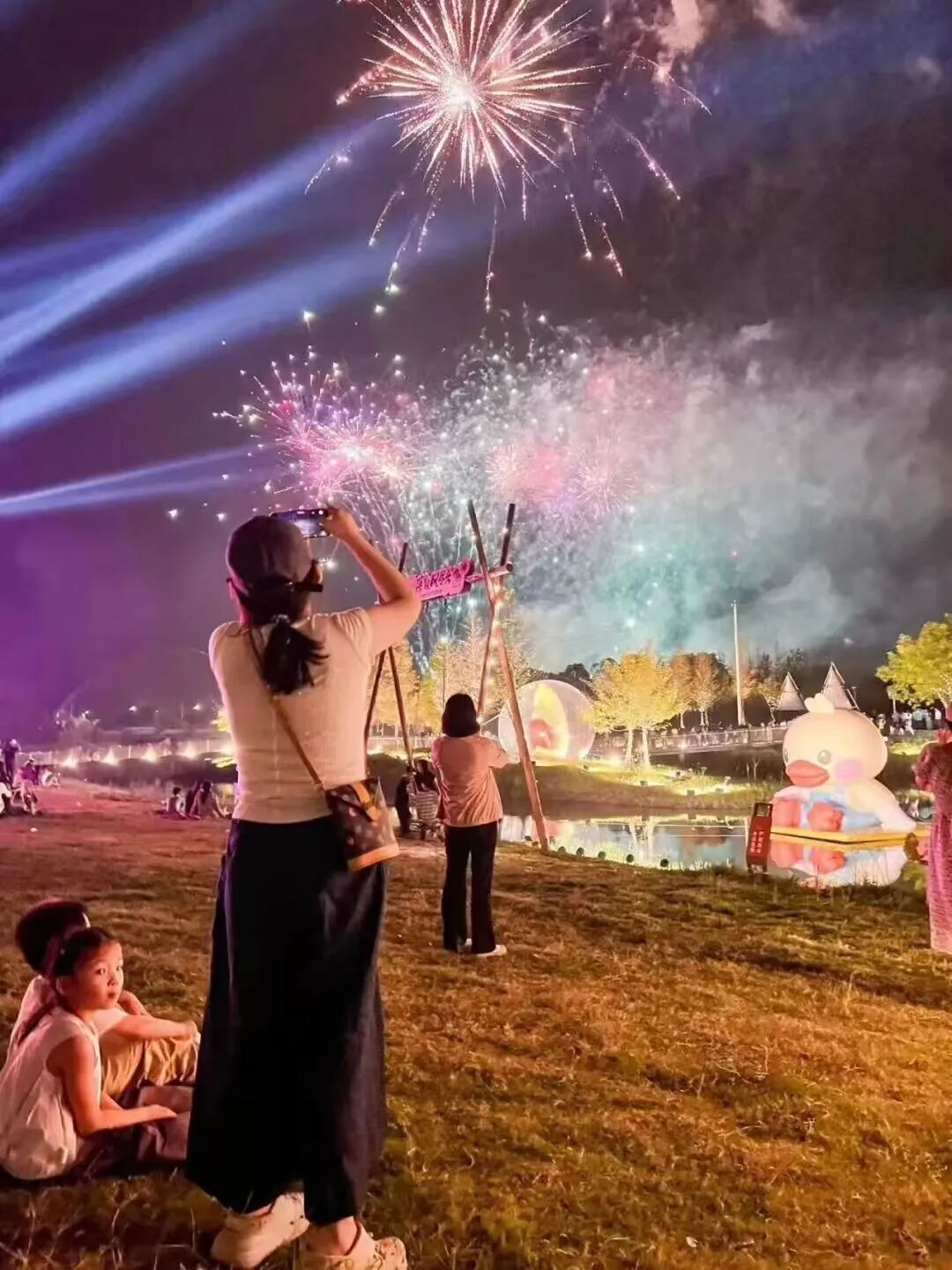 午后的消费场景愈发多元:月牙湾的田园间,游客弯腰采摘新鲜蔬菜;露营帐篷旁,烤肉香气随风飘散;江洋水库沙滩上,孩子们的嬉闹声此起彼伏,搭配道路旁飘扬的国旗,田园乐趣与节日氛围完美融合。