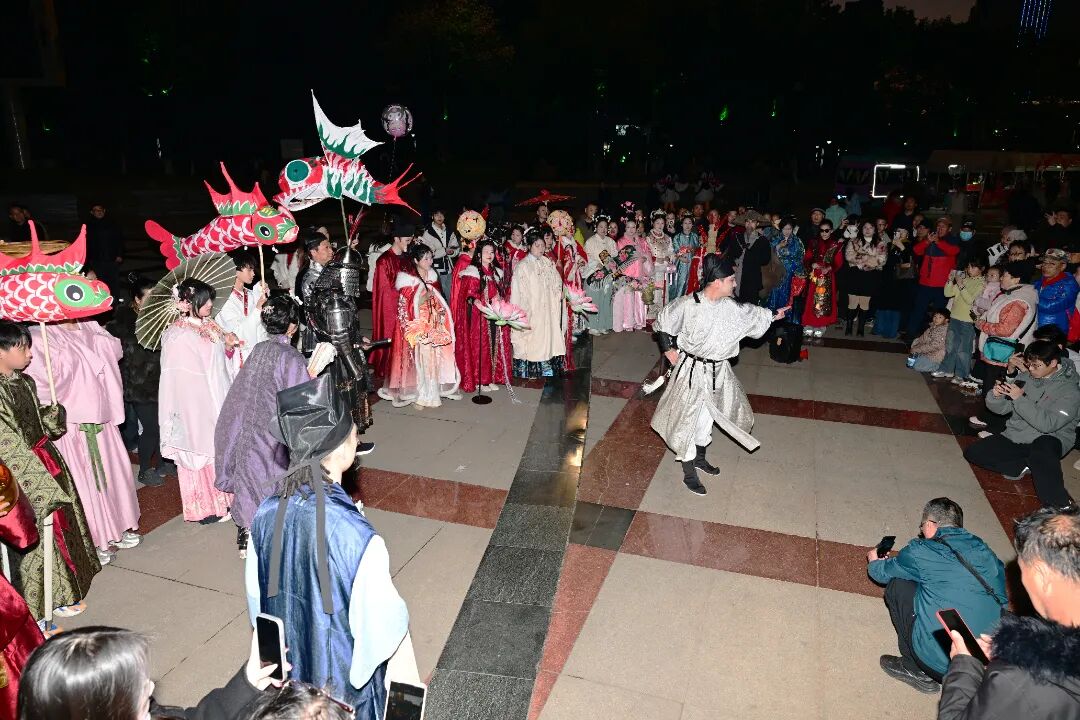 正月初五的活动主打 “传统与潮流碰撞”——上午的快闪舞蹈与霹雳街舞点燃现场气氛;午后黄梅戏《女驸马》选段与浠水杂技轮番登场,“汉服鱼灯巡游”宛如古画流动,赛新春区东北秧歌唢呐欢腾,主舞台电音演唱会动感炸裂;傍晚华灯初上,京剧经典唱段韵味悠长,“李白”舞剑、“财神爷”巡游的沉浸式场景氛围感拉满……