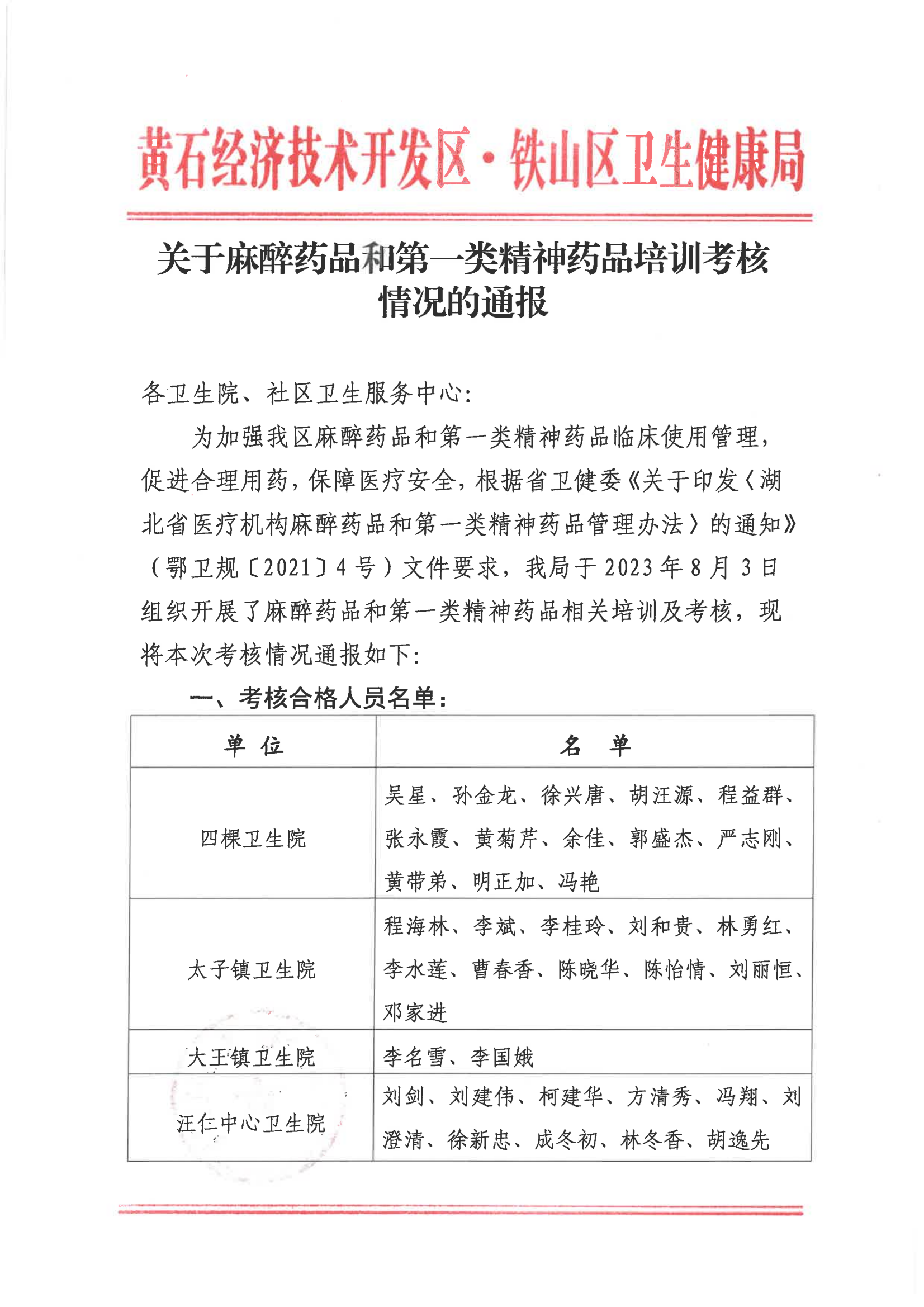 关于麻醉药品和第一类精神药品培训考核情况的通报