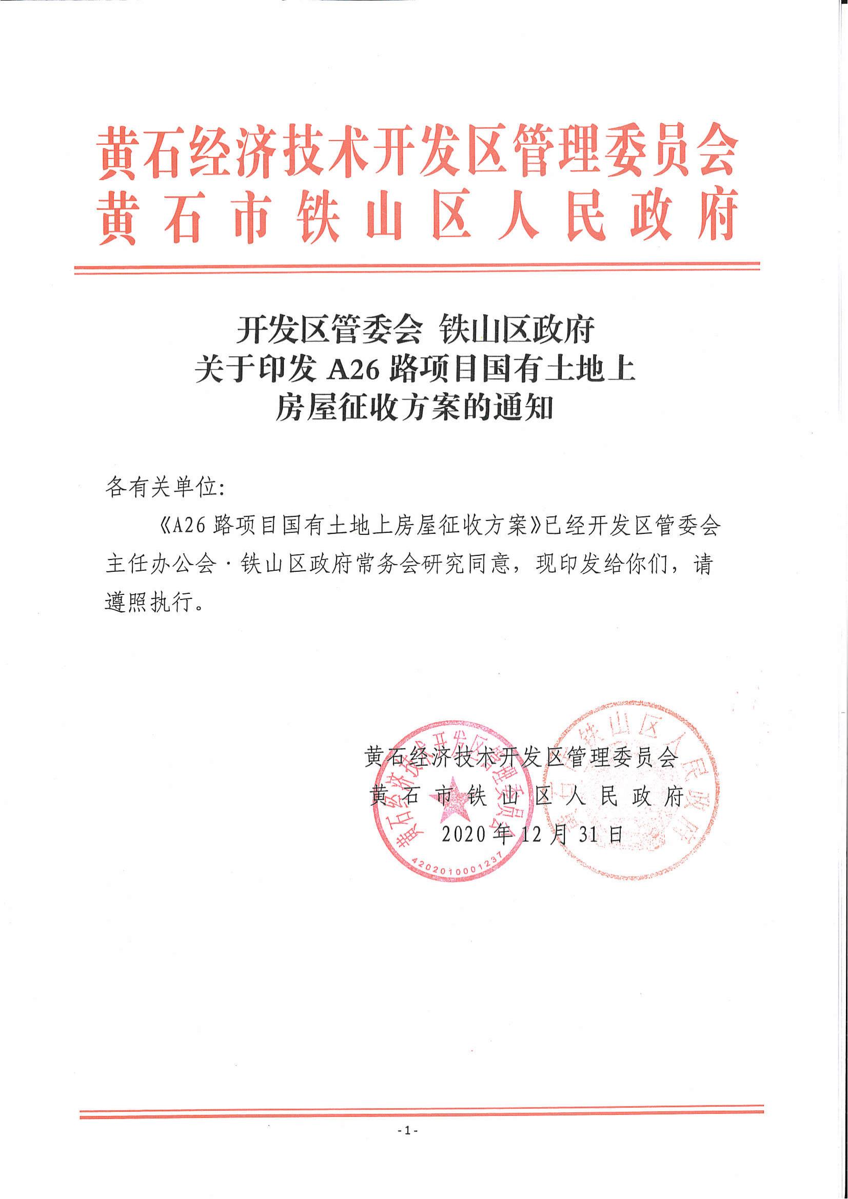 关于印发A26路项目国有土地上房屋征收方案的通知