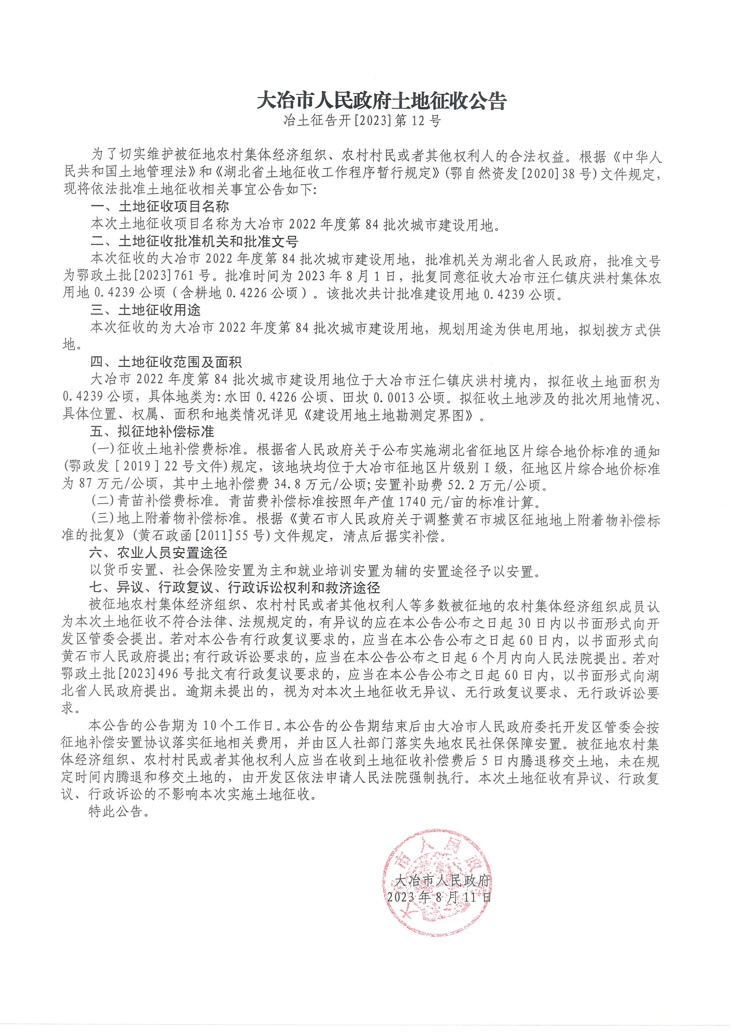 大冶市人民政府土地征收公告——冶土征告开【2023】第12号