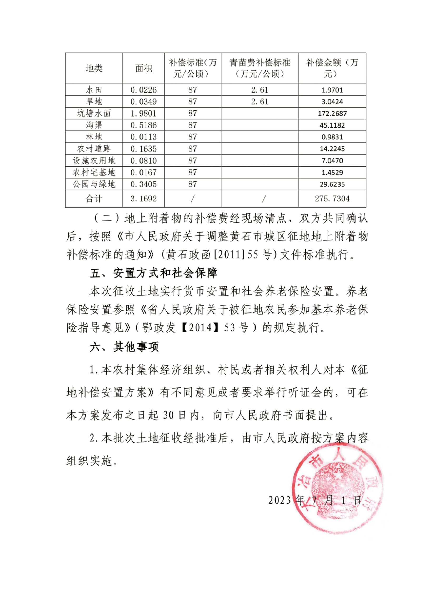 征地补偿安置方案(《大冶市 2023 年度第62批次(增减挂钩)城市建设用地(经四路(纵三路至奥体大道)道路工程)征地补偿安置方案》)