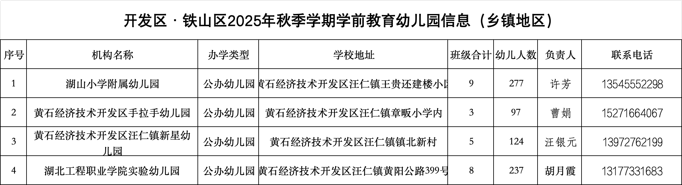 开发区·铁山区2025年秋季学期学前教育幼儿园信息(乡镇地区)