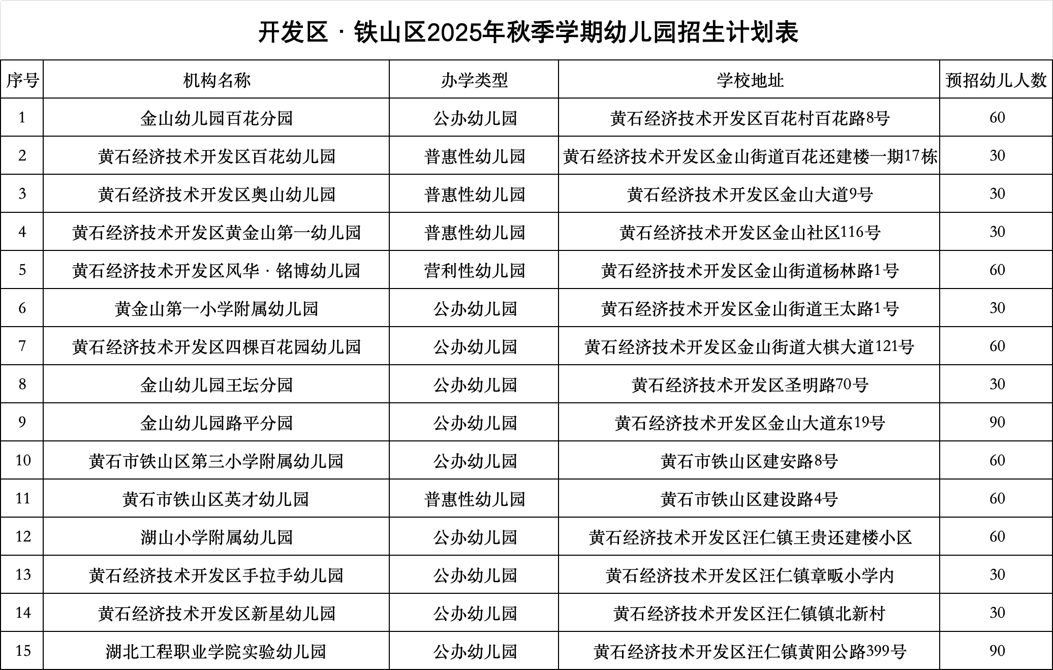 开发区·铁山区2025年秋季学期幼儿园招生计划表