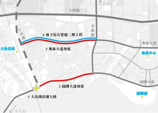 奥体大道西延东起圣明路,西至高铁大道,全长3.5公里,宽62米,总投资3.9亿元,双向八车道,规划为城市高标准主干道,路中预留14米绿化带将于后续实施城发集团的有轨电车二期,实现黄石大冶湖核心区与大冶北站的快速连接,促进黄石大冶一体化发展具有重要意义。