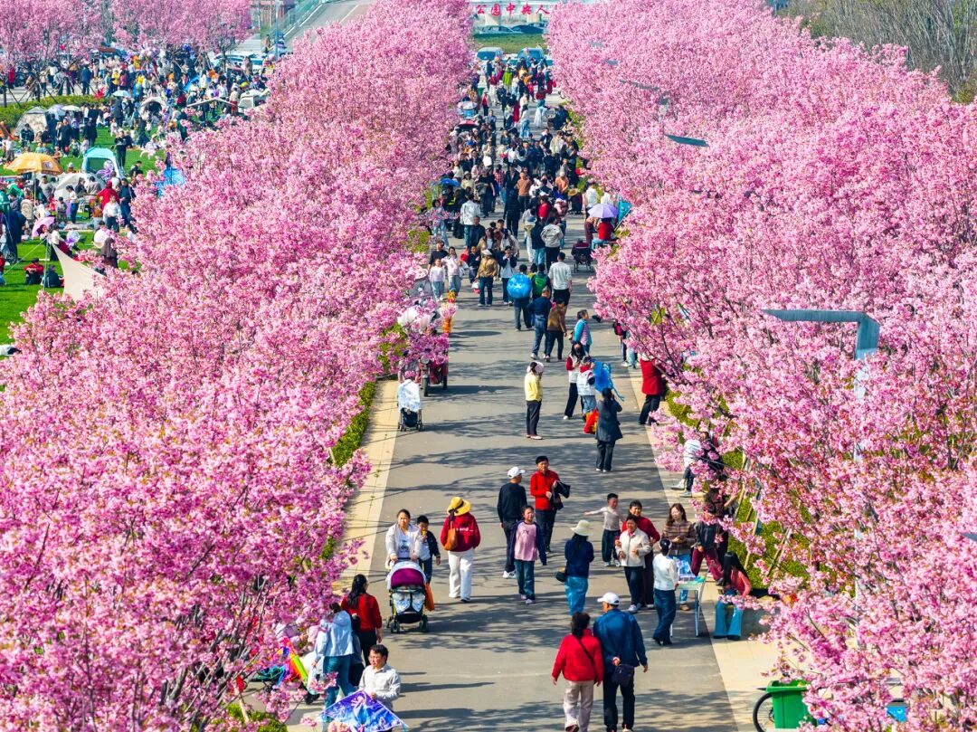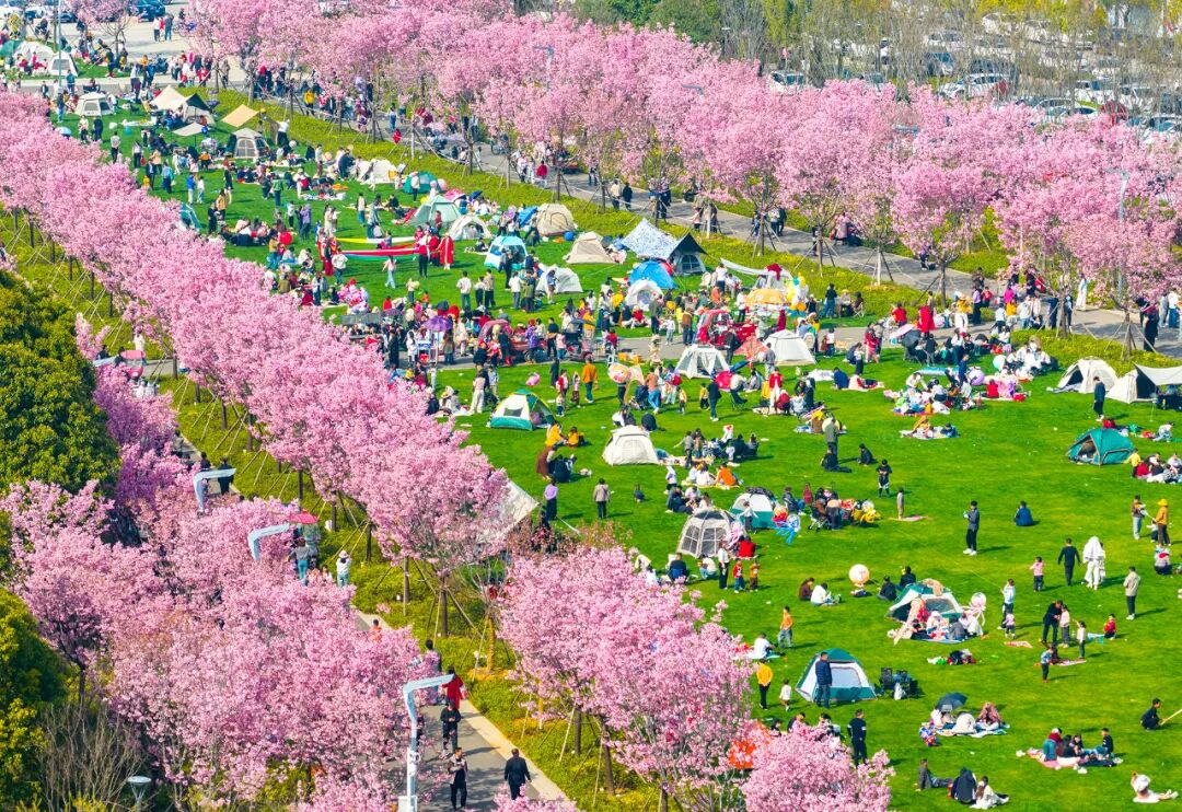 3月22日,位于开发区·铁山区的黄石奥体公园花客厅里,千株粉樱竞相盛放,樱花大道如梦似幻,开阔的大草坪上处处洋溢着轻松欢快的气息——这里既有举家踏青的市民围坐野餐、孩童迎风放风筝的热闹烟火,也有企业职工户外路演、团建踏青的蓬勃朝气。