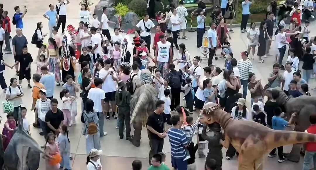 对面的恐龙奇域里,巨大的机械恐龙摆动长颈,孩子们仰头触摸 ,尖叫与欢笑穿越时空,成了最动听的假日旋律。
