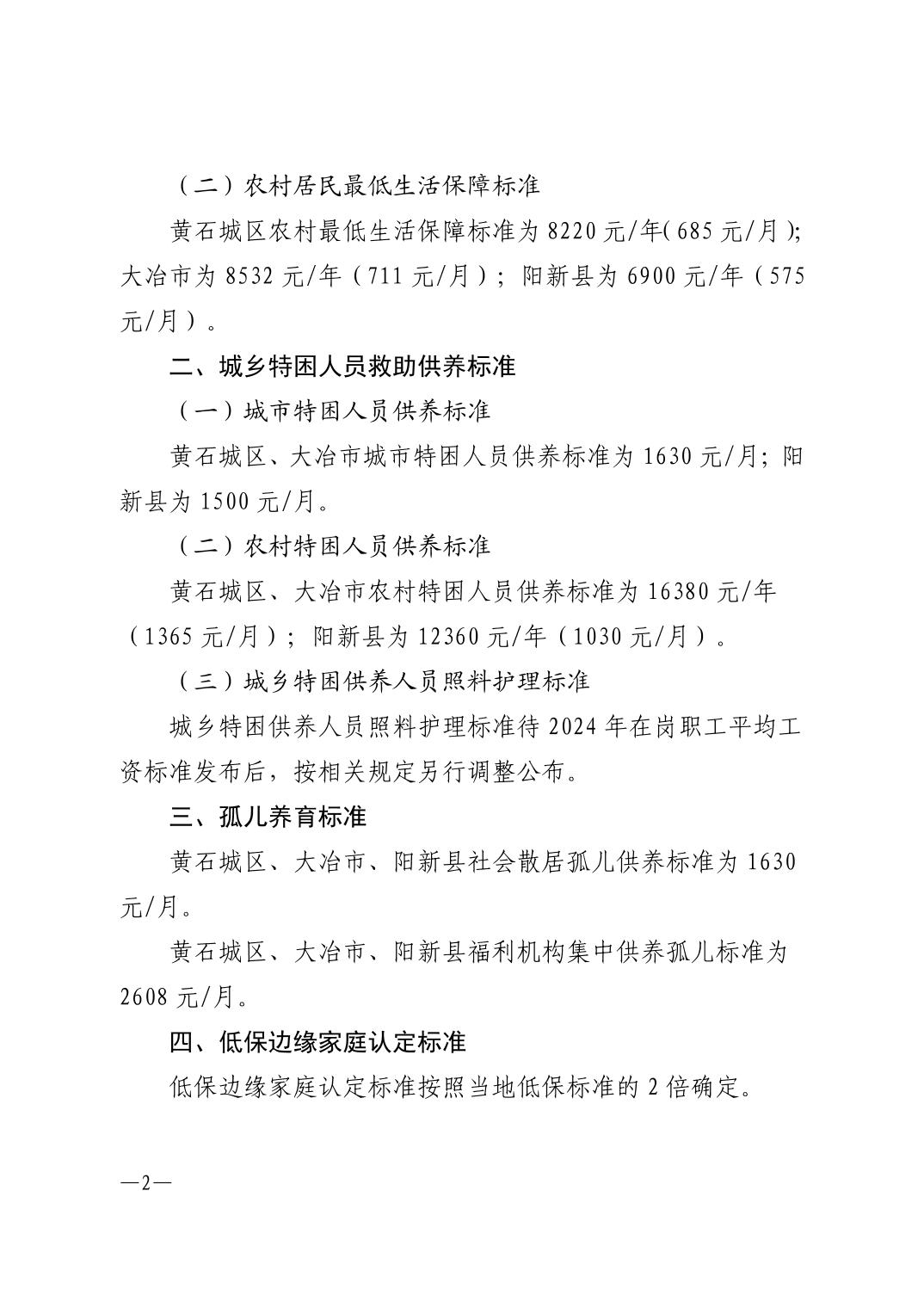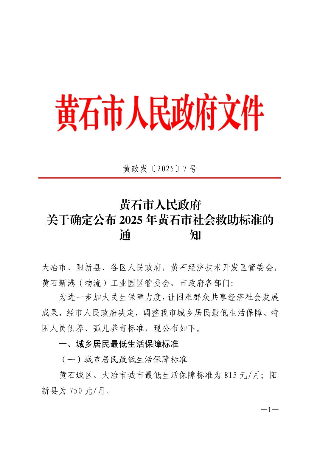 黄石市人民政府关于确定公布2025年黄石市社会救助标准的通知