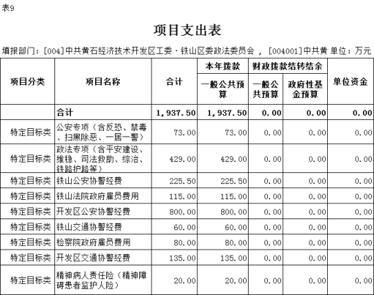 2026年,我单位按照有关政策文件和要求,开展预算绩效管理工作,实行绩效目标管理的重点项目共8个,分别是公安专项经费项目,检察院政府雇员费用项目,开发区公安协警项目,开发区交通协警项目,铁山法院政府雇员费用项目,铁山公安协警项目,铁山交通协警项目,政法专项全部纳入绩效评价,涉及一般公共预算拨款金额支出1917.5万元,年度目标1.重大恶性案件和多发性案件得到控制并逐步有所下降;2.保护弱势群体的基本人权,维护社会稳定;3.通过雪亮工程视频监控的安装建设,增强探头的覆盖率,减少违法犯罪行为的发生,为全区居民提供一个安全稳定的居住环境。4.全面深入开展创建“无毒社区”活动,实现无毒目标,推进平安社区建设,确保社区稳定。5.通过对农村(社区)配备专职辅警,提升村社区辅警力量,及时处理矛盾纠纷事件,进一步改善群众居住环境。6.集中攻坚、彻底铲除黑恶势力赖以滋生的土壤,保障人民安居乐业、社会安定有序、国家长治久安。主要是合规合法使用办公经费,保障政法委工作正常运行,通过预算经费绩效追踪,降低工作成本,做好各项工作预、决算。对所有项目都编制了目标绩效评价指标并对支出进行了细化,在项目实施过程中,通过设立四个一级指标:七个二级指标等量化本年目标数值来评价,自评等级为良好。