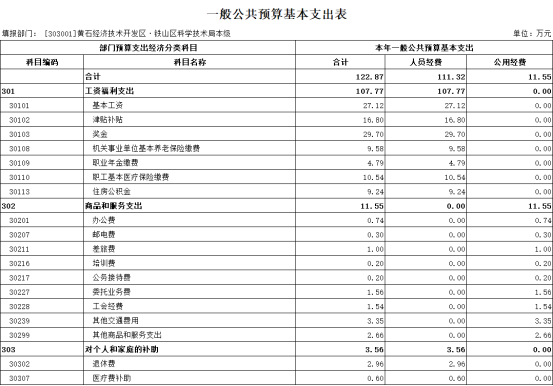 公共预算财政拨款基本支出122.87万元,其中人员经费107.77万元,包括基本工资27.12万元、津贴补贴16.8万元、奖金29.7元、机关事业单位基本养老保险缴费9.58万元、职业年金缴费4.79万元、职工基本医疗保险缴费10.54万元、住房公积金9.24万元;其他对个人和家庭的补助3.56万元;公用经费11.55万元:包括办公费0.74万元、邮电费0.3万元、差旅费1万元、培训费0.2万元、公务接待费0.2万元、委托业务费1.56万元、工会经费1.54万元、其他交通费用3.35万元、其他商品和服务支出2.66万元。