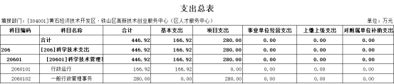 本单位2026年预算总支出446.92万元。比2025年减少392.16万元。主要原因是:一是人员减少一名,人员经费和公用经费相应减少;二是项目方面本年度孵化器平台费用项目减少165万元,人才专项项目减少200万元。