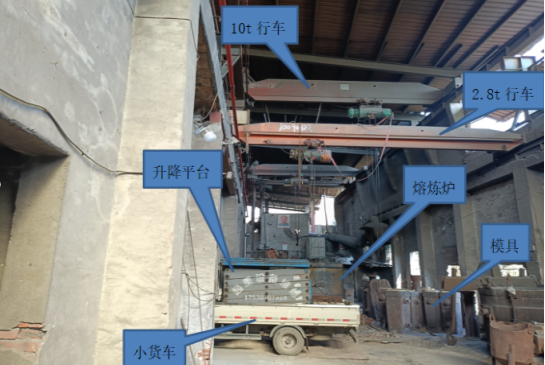 事故发生在黄石市某金属制造有限公司一车间,该车间为一栋单层厂房,呈东西方向建设,总长60m、宽36m、屋脊高14m、屋檐高11m,厂房被分隔成两跨,一跨用来存放原材料及货物运输,另一跨则为熔炼及成品存放区,事故发生在熔炼及成品存放区。熔炼跨长40m、宽9m、高11m,东端设置一台金属熔炼炉,西端存放模具和成品,上方安装有两台行车,一台10吨行车用来吊运熔炼炉,一台2.8吨行车用来吊运模具及成品,事故发生在2.8吨行车维修作业过程中(见图一、二)。