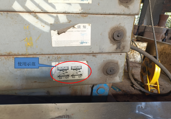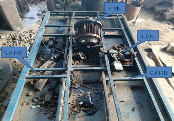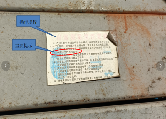 2.8吨行车单梁长9m,安装高度6.15m,所配电机铭牌标识重量93.5kg(见图三),维修行车电机使用电动升降平台作为登高工具,升降平台位于小货车车斗中,其侧面张贴有“关好护栏,方可运行”提示明显的《设备安全操作规程》和运行中护栏架设的安全示范图例(见图四、图五)。勘查时,平台防护栏杆没有架设而处于折叠卧倒状态,卧倒的栏杆上放置一台已经拆下的旧电机,平台中放置一个工具包和一些维修工具及零部件(见图六),2.8t行车电源开关处于断开状态,小货车东侧后轮上遗留当事人的血迹。