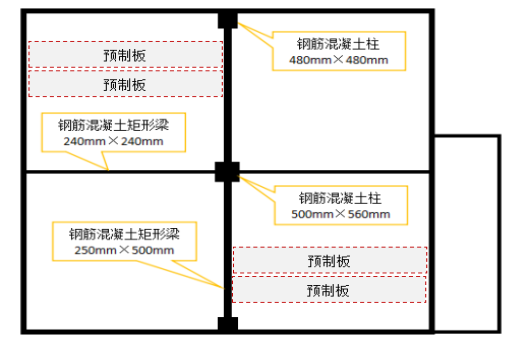 结构类型:砖混结构;屋盖型式:木檩条屋盖;基础型式:砖基础;楼盖型式:预制板楼盖;檐口高度:11.3m;房屋结构类型为砖混结构,基础型式为条形基础,横向轴线总长约19.8m,纵向轴线总长约12.9m;上部承重构件有:钢筋混凝土柱、烧结普通砖、钢筋混凝土梁、预制板。钢筋混凝土矩形梁规格尺寸有 b*h=250mmx500mm,240mm*240m等,混凝土柱尺寸为500mm*560mm,480mm*480mm等。(图二)