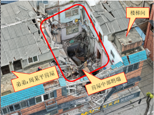 此次坍塌房屋是周某胜(哥哥)所属房屋,周某胜及其家人多年来未曾居住,房屋建成后一直是处于对外出租状态,且以一楼门面出租为主。事发前该房屋一楼、二楼、三楼均处于缺租空置状态,一楼晨光文具店前期已退租,门楼广告牌未拆除。由于装修拆改人员拆除中间承重墙造成房屋二层、三层中部坍塌,预制板从纵向两侧墙体拔出,坍塌的建筑体同时砸穿一层楼顶预制板。(图三)