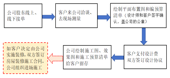 公司的运行模式:三名股东均可在线上线下开展接单业务(抖音、小红书等网络平台或者老客户介绍),接单后客户来公司沟通,确定合作意向后,公司至少委派2人一起去客户房屋现场进行测量。测量后根据客户的要求绘制平面布置图和编制预算清单,平面布置图和预算清单由设计师和客户双方签字,盖公司公章,签订设计协议,客户支付设计费,公司出施工图、效果图和施工预算。如果客户决定由公司实施装修,就签订房屋装修施工合同,公司安排人员进场装修施工(图四)。本次周某胜女儿周某请金某帮忙装修自家房屋未按照此流程进行,属个人私单行为。此前,该公司法定代表人曹某磊在2023年帮其同学张某也进行过类似装修行为。据曹某磊笔录称,私单在公司是禁止的,但每个人都会有亲戚朋友,发生这种情况由个人自己操作,公司不介入。