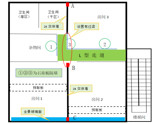 图五:二楼拆墙时内部平面布局(三楼结构相同)