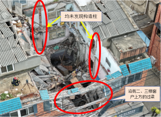 区住房保障局委托3名土木工程、结构工程专业的专家组成专家组,对现场进行实地勘查得出意见:该房屋结构类型为砖混结构,共三层,檐高约 11m,楼板采用空心板, 墙体为烧结普通砖墙(墙厚 240mm);初步判断坍塌直接原因系拆墙人员拆除二层中间部分承重砖墙,导致三层中间墙体、两侧空心板发生坍塌,靠楼梯间一侧的二层楼板同时坍塌,临街面二、三层过梁中部断裂。(图六、图七)